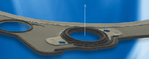 Характерный отличительный признак – эластомерные рабочие кромки уплотнения, которые в области отверстия для прохождения воды и гидравлического масла выше примерно на 3 мм. На критической отметке прохождения воды и масла (выхлопная сторона ГБЦ) находится эластомерная рабочая кромка уплотнения с дополнительным защитным кольцом из металла.